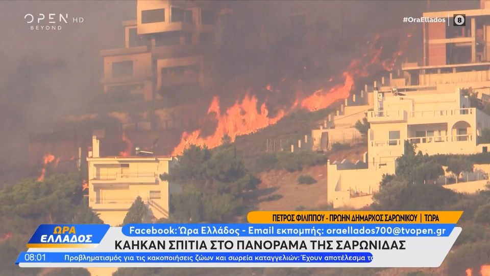 “Έχουμε ζήσει καταστροφές αλλά την τωρινή καταστροφή δεν την έχουμε ξαναδεί ποτέ. Σχεδόν έχει καεί ολόκληρος ο δήμος Σαρωνικού, ξεκινώντας από τον Κουβαρά, πέρασε στο Πάνειο όρος προς τα Καλύβια, έκαψε όλο το Πάνειο, κατέβηκε μετά σε παραθαλάσσιες περιοχές, στο Λαγονήσι, Όλυμπος, Φέριζα και άλλες, στη συνέχεια προχώρησε προς το βουνό της Σαρωνίδας, έκαψε και αρκετά σπίτια στο Πανόραμα, δεν έχω εκτίμηση για το πόσα ακριβώς, πολλές περιοχές δεν έχουν ρεύμα και μαζί με αυτό δεν υπάρχει και νερό γιατί όταν δενέχουμε ρεύμα, δεν δουλεύουν τα πιεστικά μηχανήματα για να πάνε νερό στις δεξαμενές και η κατάσταση δυσκολεύει”, δήλωσε ο πρώην δήμαρχος Σαρωνικού μιλώντας στο MEGA.