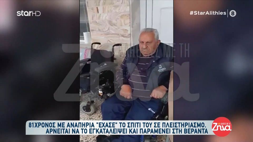«Μπήκαν στις 07:00 το πρωί, την ώρα που κοιμόμασταν με κλειδαρά. Είχαν δικαστικό κλητήρα, δικηγόρο και μπούκαραν μέσα στο σπίτι. Την ώρα που κοιμόμασταν, μας πήραν από το κρεβάτι και μας έβγαλαν έξω με αναπηρικό αμαξίδιο. Ο γιος μου πήρε ένα δάνειο 70.000 ευρώ και εγώ έγινα εγγυητής. Πλήρωσε 50 και μας έβγαλαν το σπίτι σε πλειστηριασμό. Από χθες είμαστε έξω από το σπίτι και κοιμόμαστε στο μπαλκόνι. Είμαστε “εγκληματίες”, ήρθαν δέκα περιπολικά εδώ να βγάλουν έξω έναν “εγκληματία” έξω που έχει αναπηρία τα τελευταία 24 χρόνια με 85%», ανέφερε ο ίδιος.